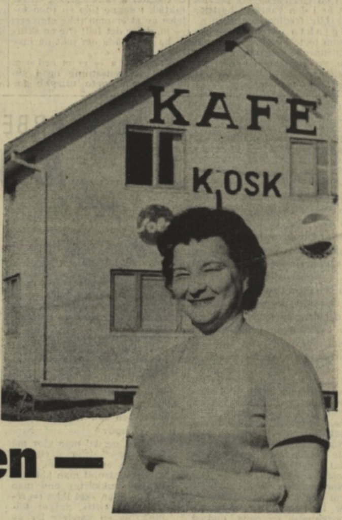 Før han døde hadde vi bilverksted og sjåførskole i Nydal, men ‘ da jeg ble igjen alene, måtte jeg klare meg selv og startet denne kafeen. Vi flyttet den fra Nydal etter at den nye riksvegtraseen kom, og det går så tålelig bra.
